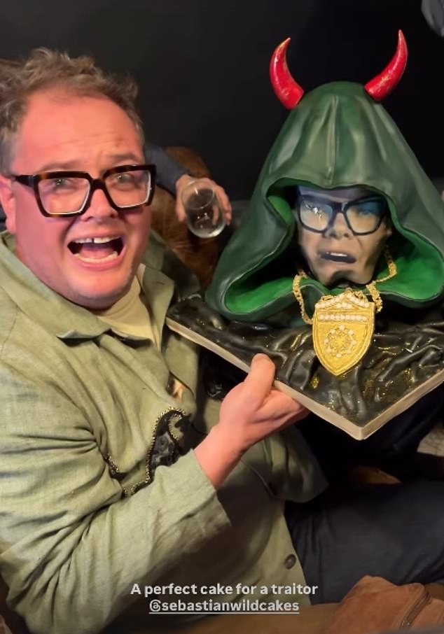 Alan was treated to a huge cake with his face on wearing the iconic green Traitors cloak as he shouted, ‘I’m the winner!’