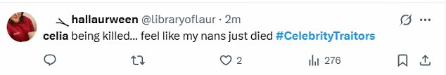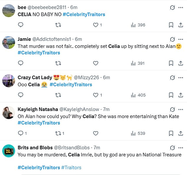 ‘RIP Celia you iconic Queen’; ‘That murder was not fair.. completely set Celia up by sitting next to Alan’;