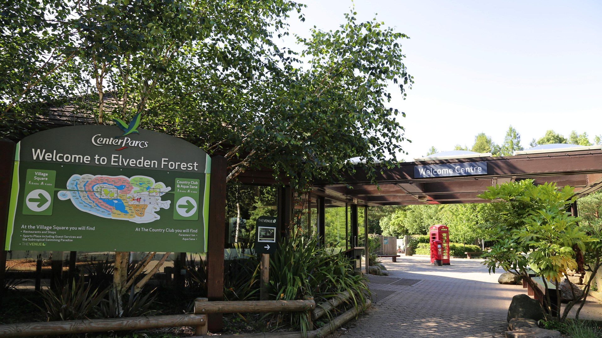 Welcome Centre at Center Parcs Elveden Forest with directions to Village Square and Country Club & Aqua Sana.