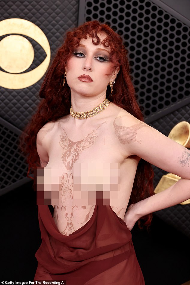 Upon arriving to the red carpet, the Pink Pony Club singer turned heads as she removed the shawl across her chest and exposed her bare breasts.
