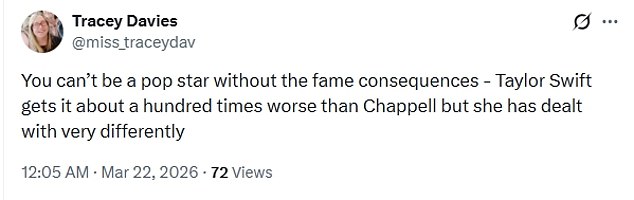 One wrote on X: ‘You can’t be a pop star without the fame consequences – Taylor Swift gets it about a hundred times worse than Chappell but she has dealt with very differently.’