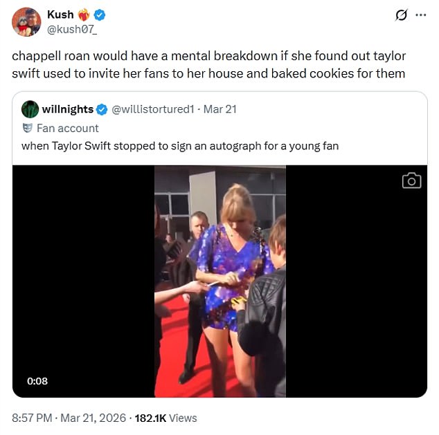 ‘Chappell Roan would have a mental breakdown if she found out Taylor Swift used to invite her fans to her house and baked cookies for them’, another wrote as they reshared a video of Taylor making sure to go back and sign an autograph for a fan after she realised she’d accidentally walked past her in a crowd.