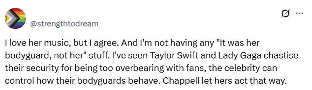 Another said: ‘I’m not having any “It was her bodyguard, not her” stuff. I’ve seen Taylor Swift and Lady Gaga chastise their security for being too overbearing with fans, the celebrity can control how their bodyguards behave. Chappell let hers act that way.’