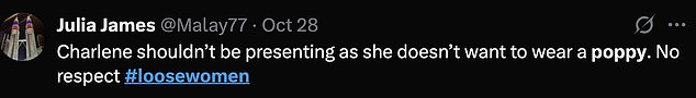 One fan wrote after noticing the missing poppy: ‘Charlene shouldn’t be presenting as she doesn’t want to wear a poppy. No respect.’