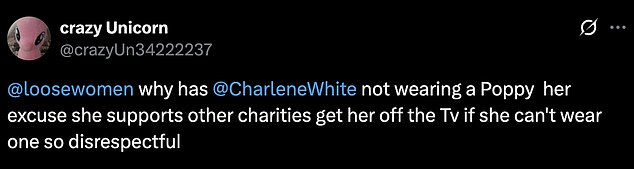 A fifth added: ‘Why isn’t Charlene White wearing a poppy?! Everyone else on Loose Women panel is. Disgraceful,’ while a sixth said: ‘Total disgrace to the memory of those who gave their lives for our future’.