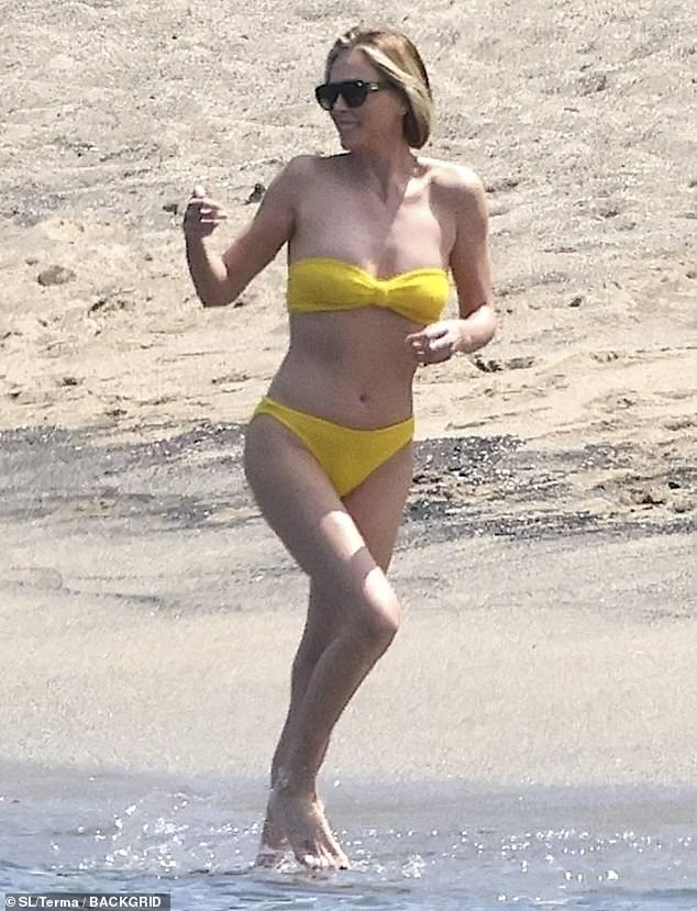 The 50-year-old thespian was pictured enjoying the ocean while in a canary yellow bikini which consisted of a strapless top that gathered in front and hip-hugging briefs.