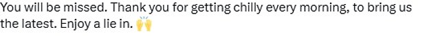 ‘You will be missed. Thank you for getting chilly every morning, to bring us the latest. Enjoy a lie in.’