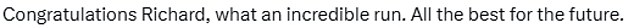 ‘Congratulations Richard, what an incredible run. All the best for the future.’