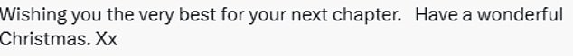 ‘Wishing you the very best for your next chapter. Have a wonderful Christmas. Xx.’