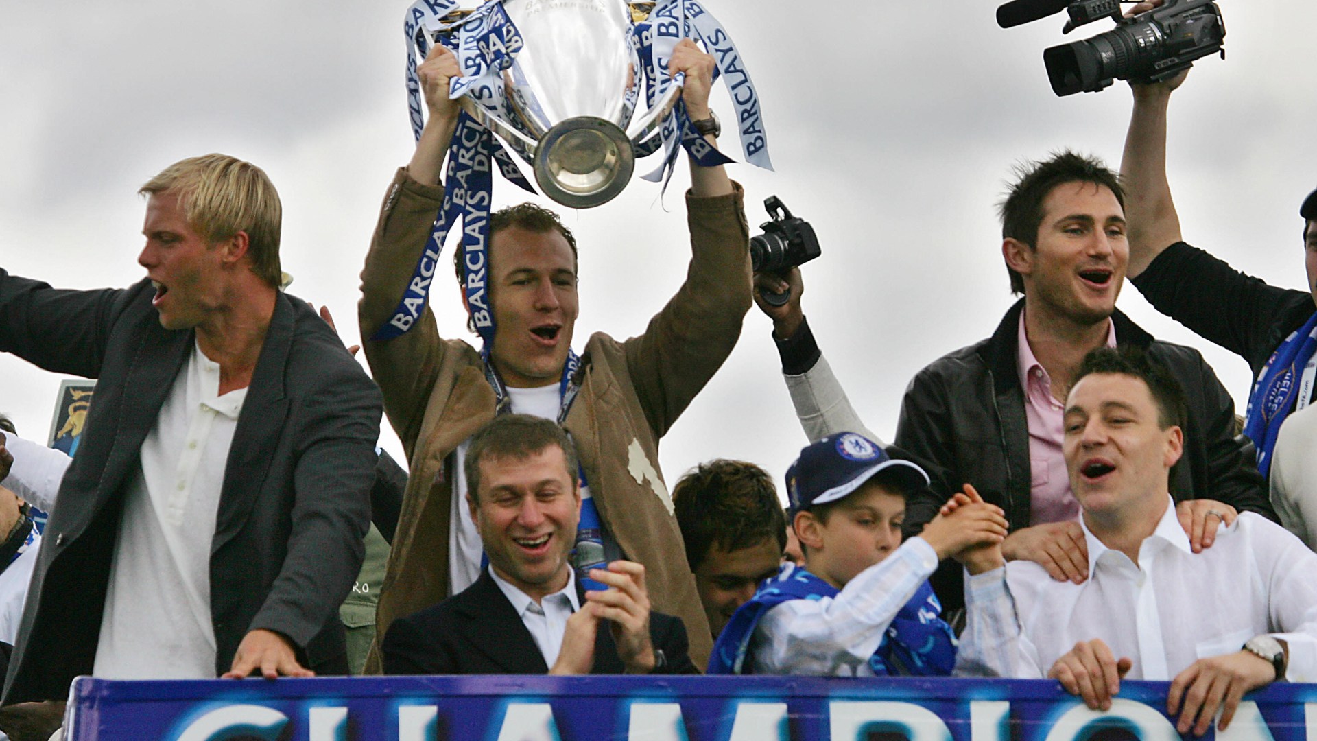 Chelsea striker Arjen Robben (C) holds t
