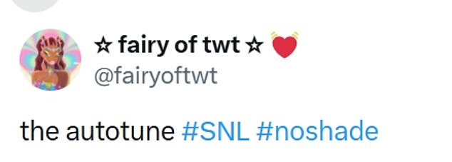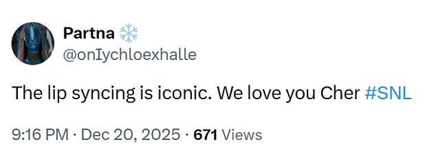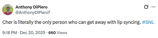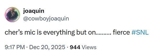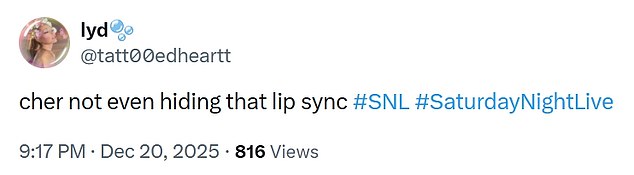 Another snorted: ‘cher not even hiding that lip sync,’ while still another wrote of her sparkly silver microphone: ‘cher’s mic is everything but on………. fierce.’