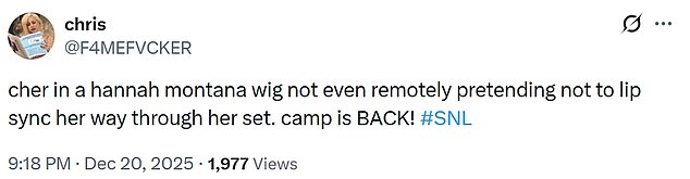 One exulted on X, formerly Twitter: ‘cher in a hannah montana wig not even remotely pretending not to lip sync her way through her set. camp is BACK!’