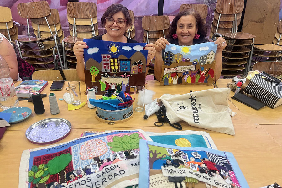 “The United States of Trump is putting its eagle’s talons into another country that dares do things it doesn’t like,” says Claudia Lara, stitching a brightly colored panel depicting a street protest. “We in Chile know about those talons. It was the CIA and the U.S. military that took away our democracy and gave us a dictatorship.”
