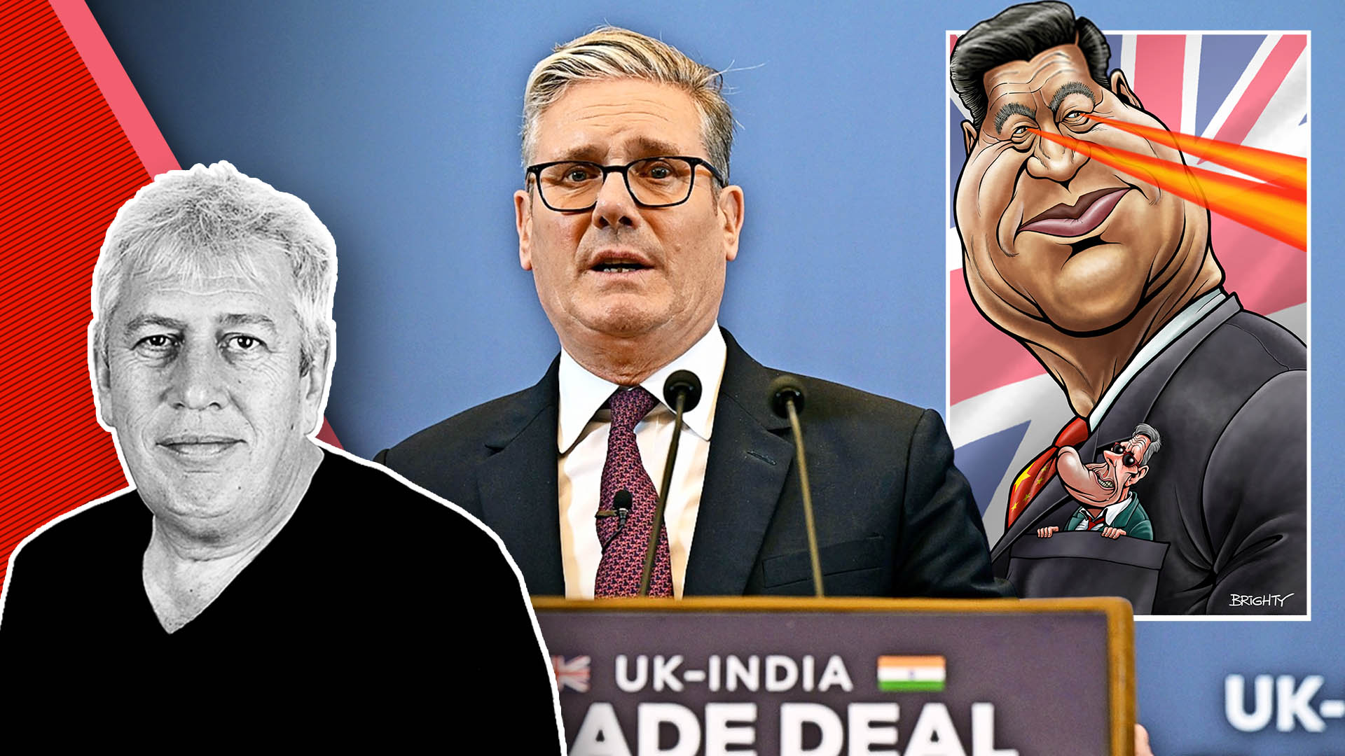 Illustration of a large caricature of Xi Jinping with laser eyes, against a British flag, with a smaller caricature of Rishi Sunak in his jacket pocket.