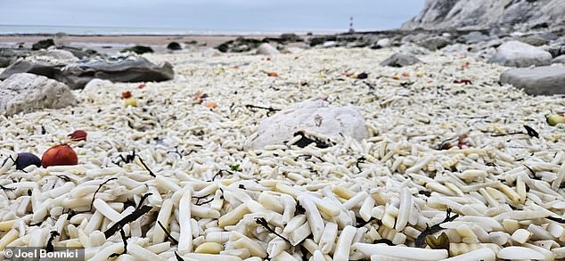 ‘In some areas, the chips were two-and-a-half feet deep into the ground. Among the unusual sightings of washed-up items – including onions found earlier this week – nothing compares with this.’