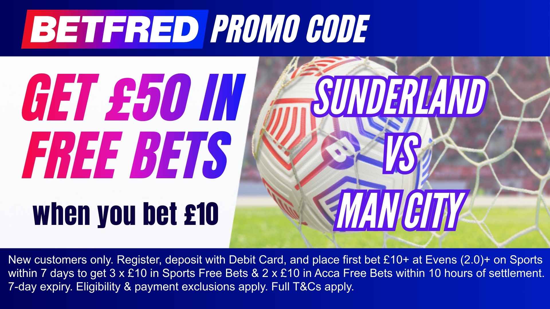 - Place a qualifying wager of £10 or more on Sunderland vs Man City (or any sports market) at odds of Evens (2.0) or greater.