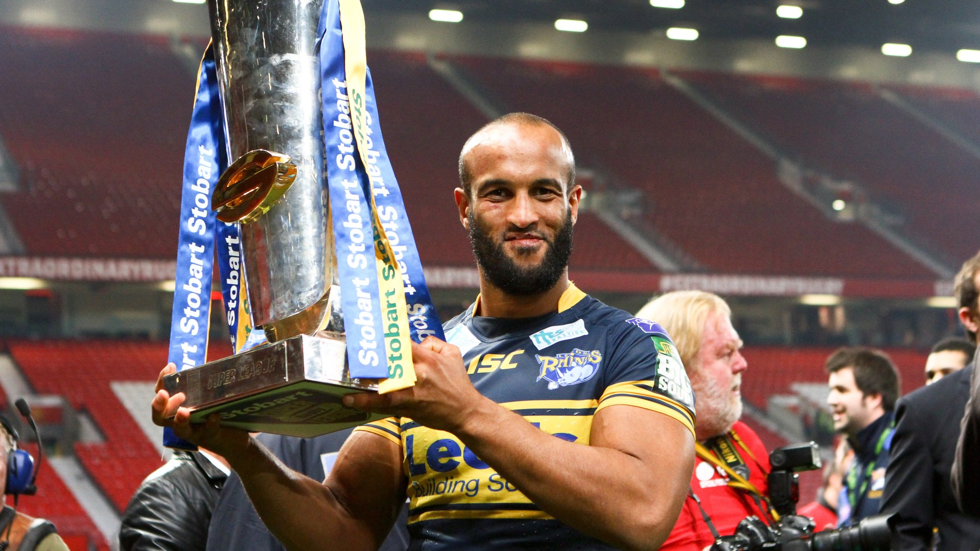 A Leeds Rhinos player holding the Super League trophy.