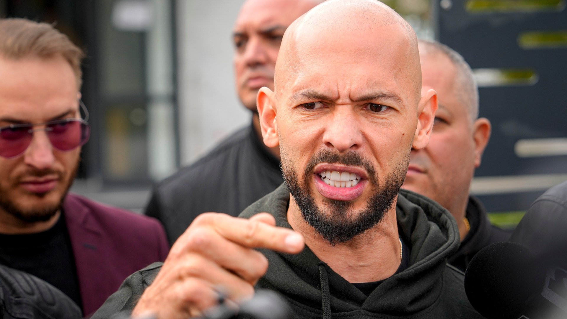 Andrew Tate appearing in court, looking to the side.