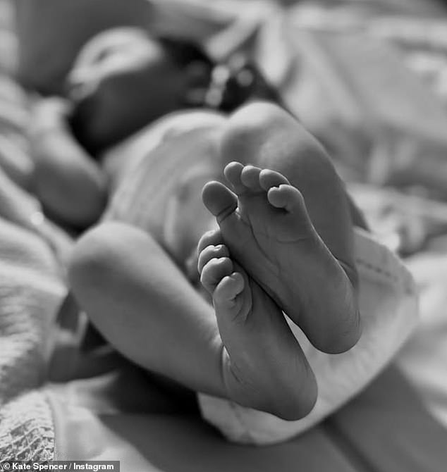 Posting her first photo of the newborn baby and confirming his name, Spencer – who announced her pregnancy in October – wrote: ‘Baby Zach burst into the world last week and safe to say, we are utterly besotted.