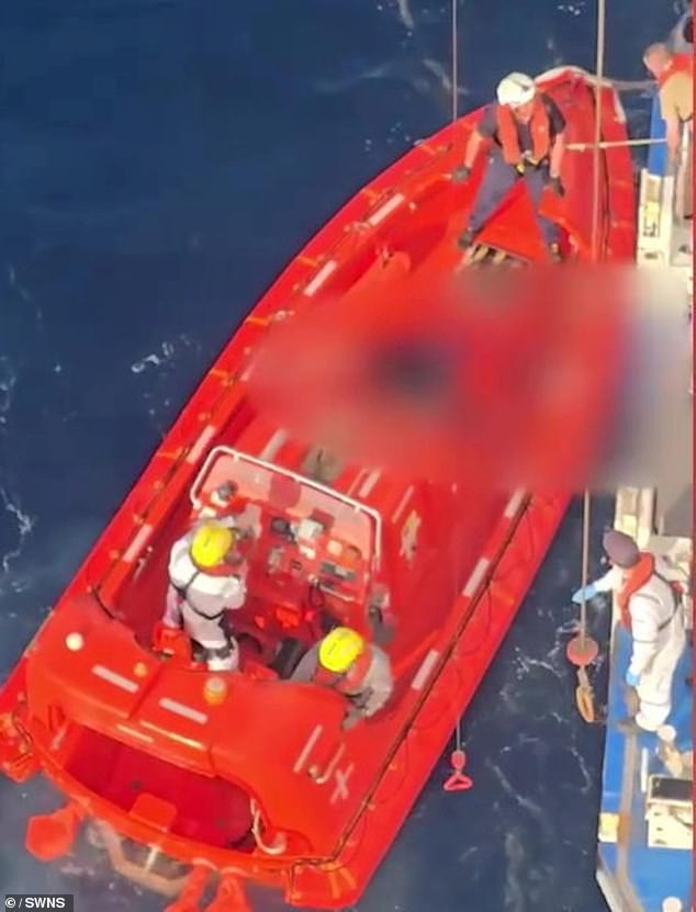 Footage shows the body of a man, wearing a purple top and black shorts, being lifted into a lifeboat before being covered and brought on board.