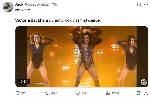 The desperation of fans to view the video was clear in a number of tweets, with messages reading: ‘Manifesting a leaked video of Victoria Beckham hijacking Brooklyn’s first dance…