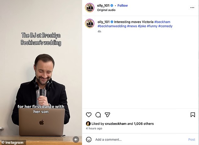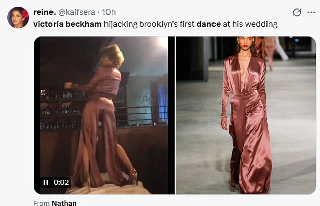 One of the tongue in cheek videos showed a dancer aggressively pushing over a reveller in a bar with the added caption: ‘Victoria hijacking the first dance at Brooklyn Beckham’s wedding.’