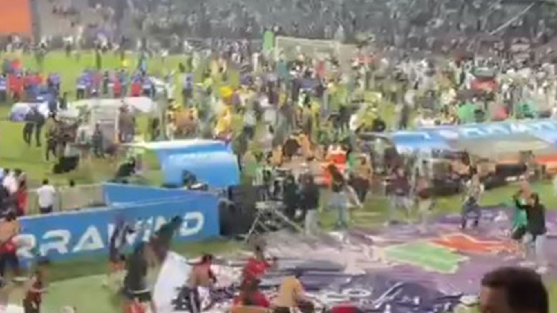 A FOOTBALL cup final descended into chaos with a pitch invasion and FENCES thrown as hundreds of supporters clashed.