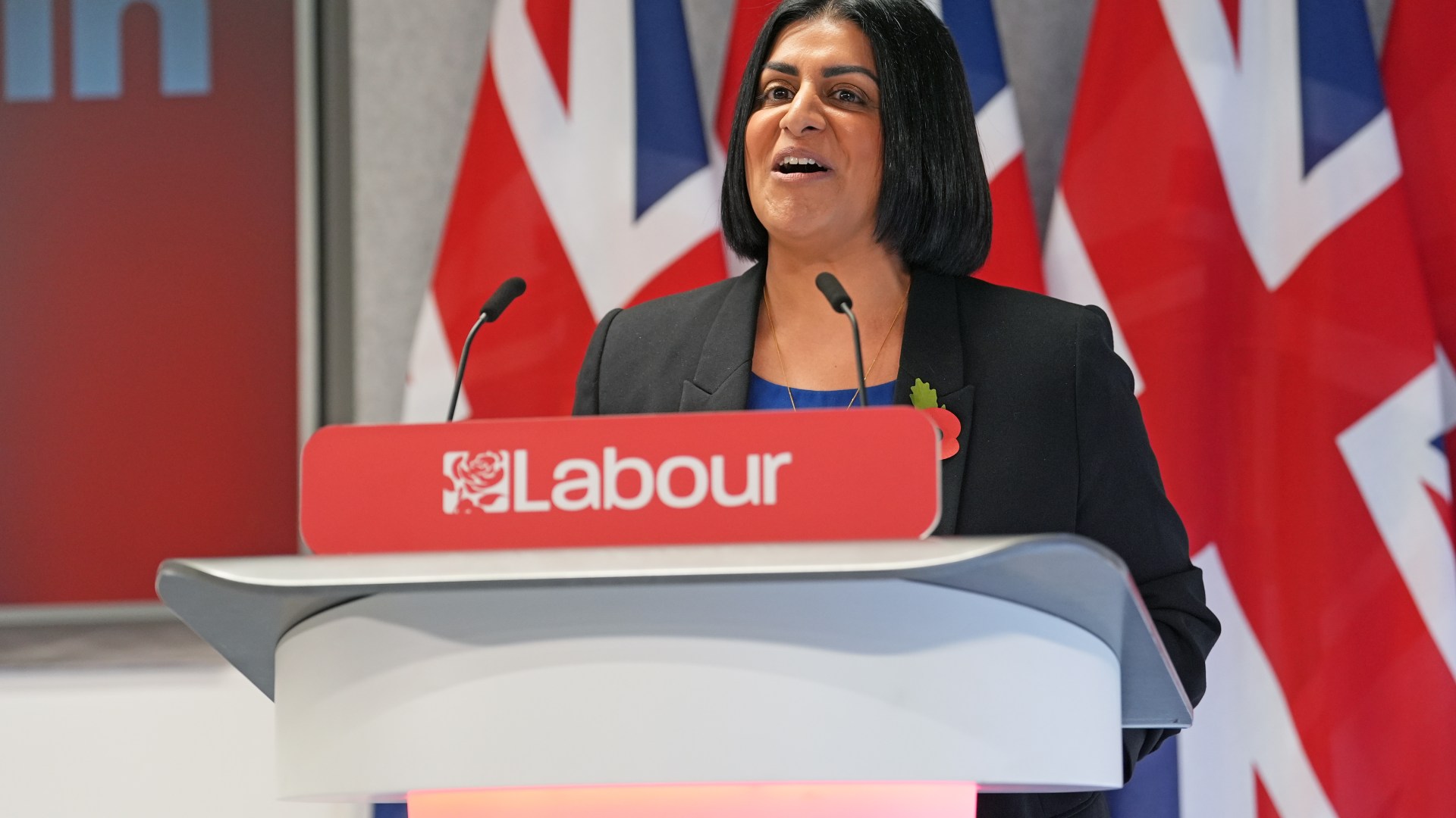 Home Secretary Shabana Mahmood speaking at a podium with "Labour" written on it.