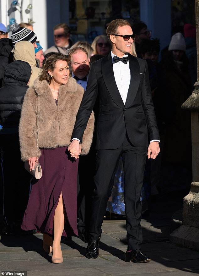 Dan cut a dapper figure in a black tuxedo while Sarah stunned in a purple dress, fur coat and nude heels.