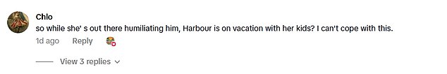 One person wrote on: ‘So while she’s out there humiliating him, Harbour is on vacation with her kids? I can’t cope with this.’