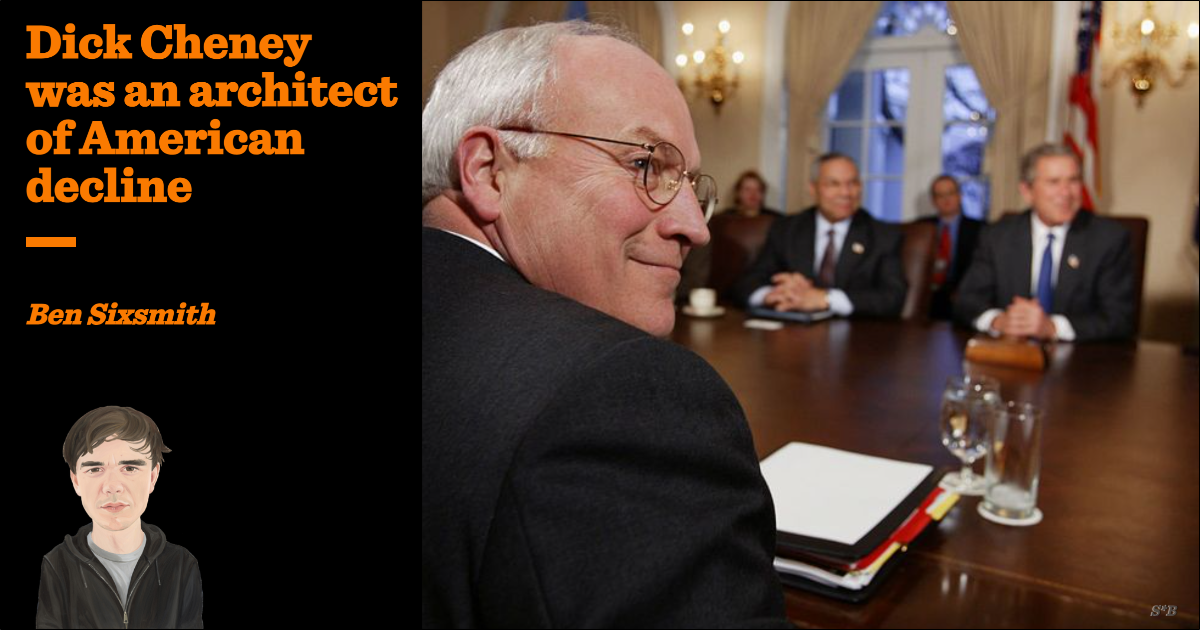 Yet obituaries are the stuff of legacy building, so it is important to be honest about Mr Cheney’s most significant contributions to the world. The Bush administration took the promise of the post-Soviet era, and the outpouring of sympathy that was produced by 9/11, and destroyed them with their stupid and dishonest wars and their hypocritical combination of the rhetoric of human rights and the furtive use of torture and extrajudicial detention. Trump’s rhetoric of “Making America Great Again” struck a chord because men like Cheney had contributed so much to its decline.
