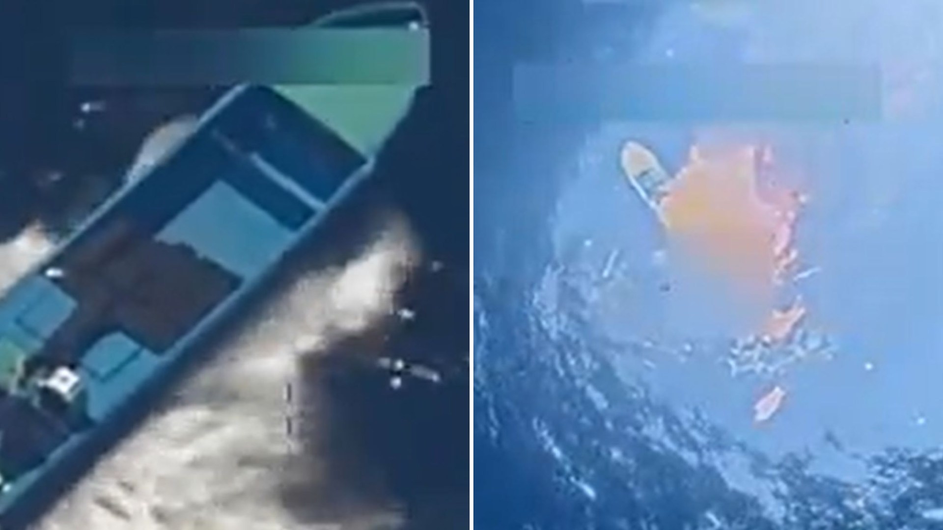 Dramatic footage showed a small boat rocking around in choppy waters before it was targeted by a US missile.