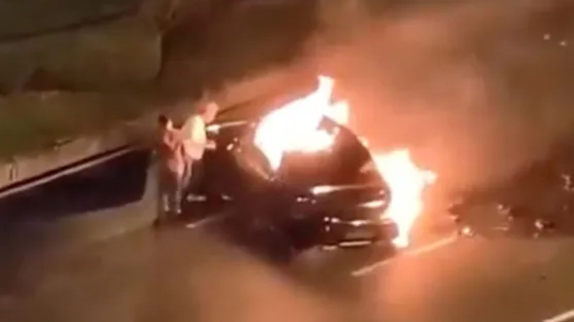 Moments earlier, the sedan had smashed into a green belt at high speed, spun into the oncoming lane and erupted into flames.