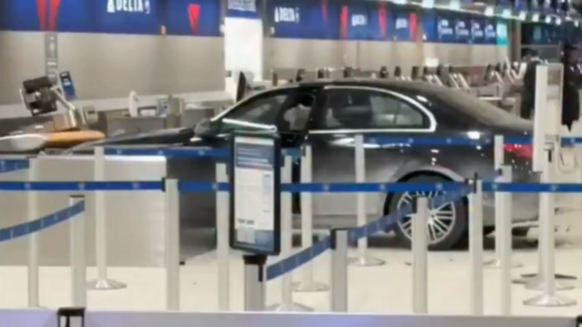 Delta Airlines staff were given the fright of their lives when the vehicle came smashing through the terminal’s glass doors at around 7.30pm.