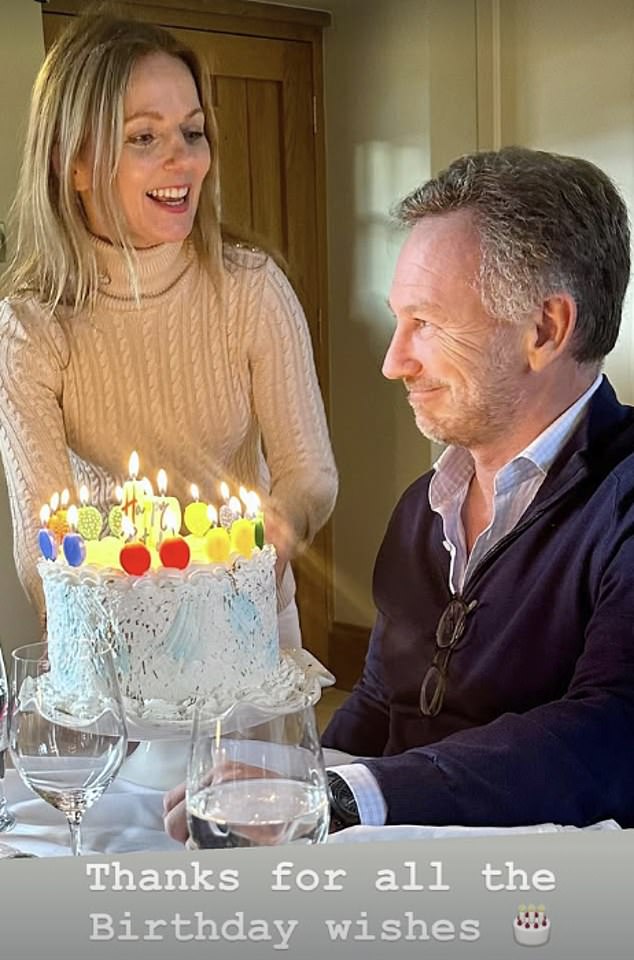 For his 52nd birthday on Sunday, he looked as cheerful as could be as his wife, former Spice Girls singer Geri Halliwell, 53, presented him with a white cake adorned with multi-coloured candles.