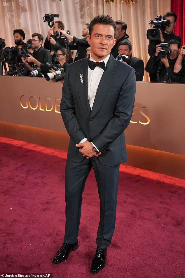 Orlando Bloom, 48, posed for the cameras in a classic navy suit, while Jacobi Jupe, 12, looked stylish in velvet.