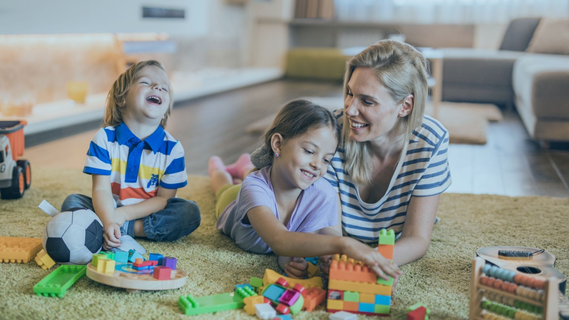 An image collage containing 1 images, Image 1 shows Mother and children playing with toys on a carpet in the living room