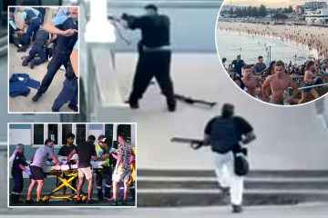 Video of two of the gunmen showed incredible footage of a hero shopkeeper wrestling a rifle away from one of the Bondi Beach attackers.