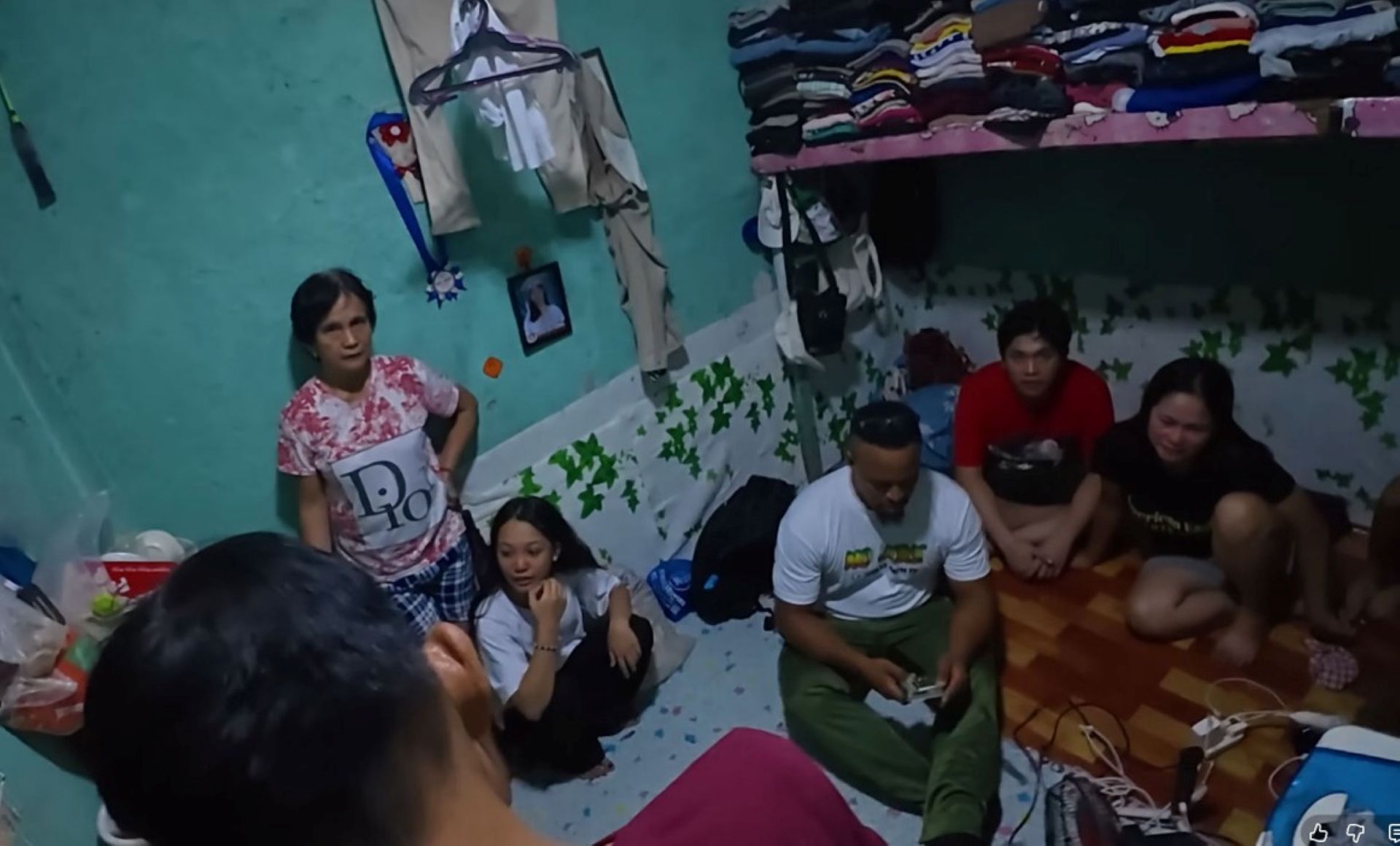 One group of eight relatives sleep together in a single room beneath a shelf packed with all their folded clothing.