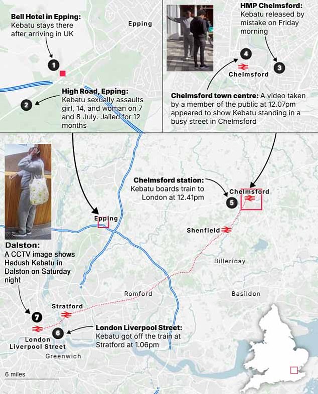 Hadush Kebatu was set free from HMP Chelmsford in error on Friday just four weeks after being sentenced for sexually assaulting a 14-year-old girl and a woman in Epping, Essex, while being housed at an asylum seeker hotel.