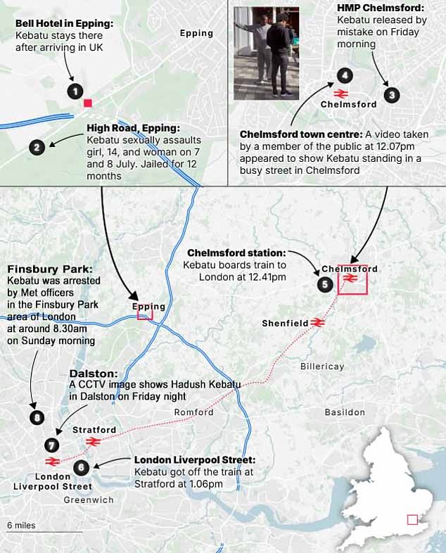 Kebatu was set free from HMP Chelmsford in error on Friday just four weeks after being sentenced for sexually assaulting a 14-year-old girl and a woman in Epping, Essex, while being housed at an asylum seeker hotel.