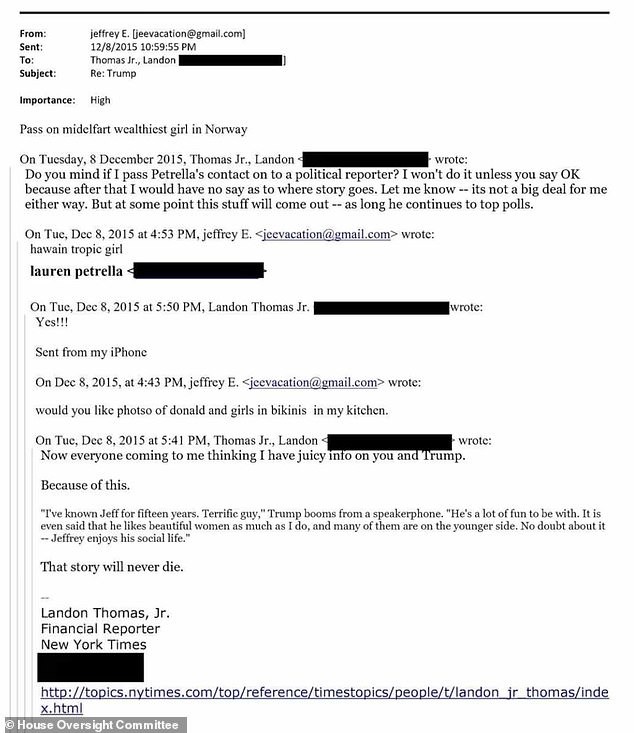 Landon emailed Epstein in December of 2015 referencing the above quote from Trump, saying: ‘Because of this. That story will never die.’