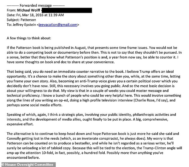Wolff also advised Epstein that the publication of it offered Epstein a chance to become 'an anti-Trump voice'