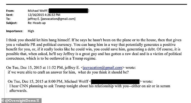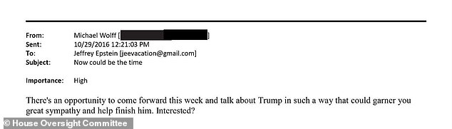 In an earlier email from October of 2015, Wolff asked Epstein: ‘There’s an opportunity to come forward this week and talk about Trump in such a way that could garner you great sympathy and help finish him. Interested?’ It is unclear if Epstein responded.