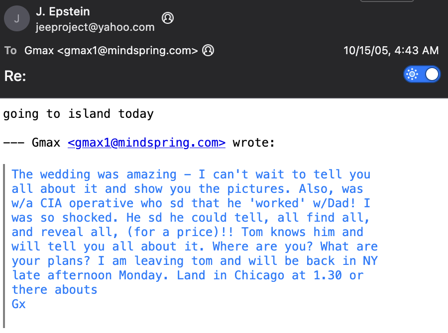 An email obtained from Epstein’s Yahoo! inbox, dated October 15, 2005, suggests Ghislaine Maxwell was trying to purchase information about her father’s missing fortune from a CIA operative. Maxwell emailed Epstein excitedly while visiting Bhutan for the wedding of Princess Chimi Yangzom Wangchuck. She wrote Epstein, “The wedding was amazing…Also was w/a CIA operative who sd that he ‘worked’ w/Dad! I was so shocked. He sd he could tell, all find all, and reveal all, (for a price)!!”