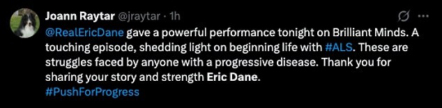 Eric Dane's, 53, guest appearance on Brilliant Minds proved especially poignant as he portrayed a firefighter battling ALS amid his own struggle with the degenerative condition