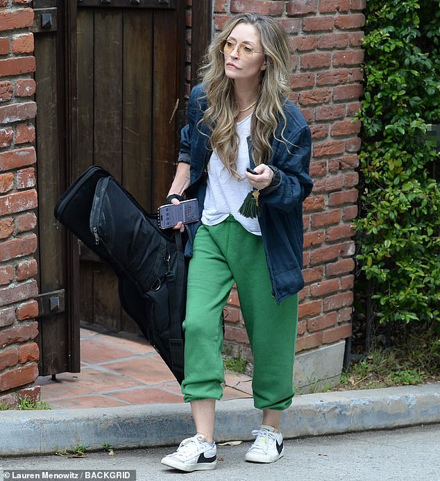 She later brought out a black guitar case while also carrying her phone in her right hand.
