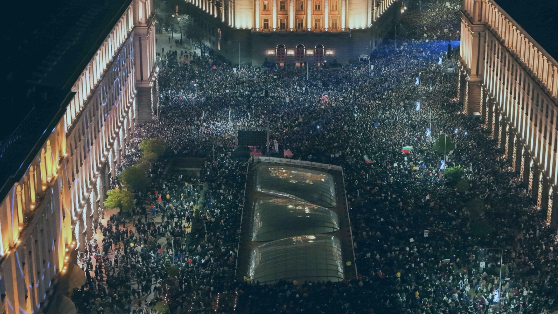 Media reports said the words “Resignation” and “Mafia Out” were projected across the parliament building as crowds swelled.