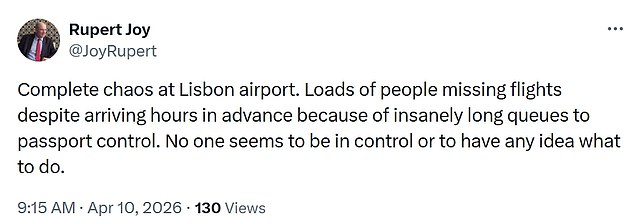 He wrote on social media platform X: ‘Complete chaos at Lisbon airport. Loads of people missing flights despite arriving hours in advance because of insanely long queues to passport control. No one seems to be in control or to have any idea what to do.’