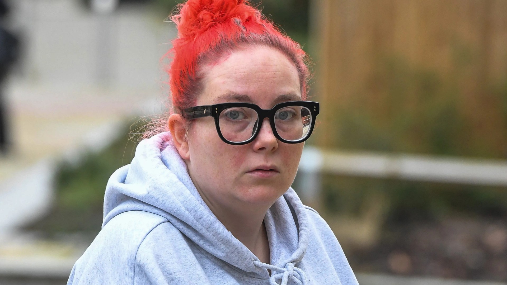 Stacey Sharples arriving at Bolton Crown Court, wearing a gray hoodie with a "VANS" logo and black-framed glasses, facing charges of perverting the course of justice.